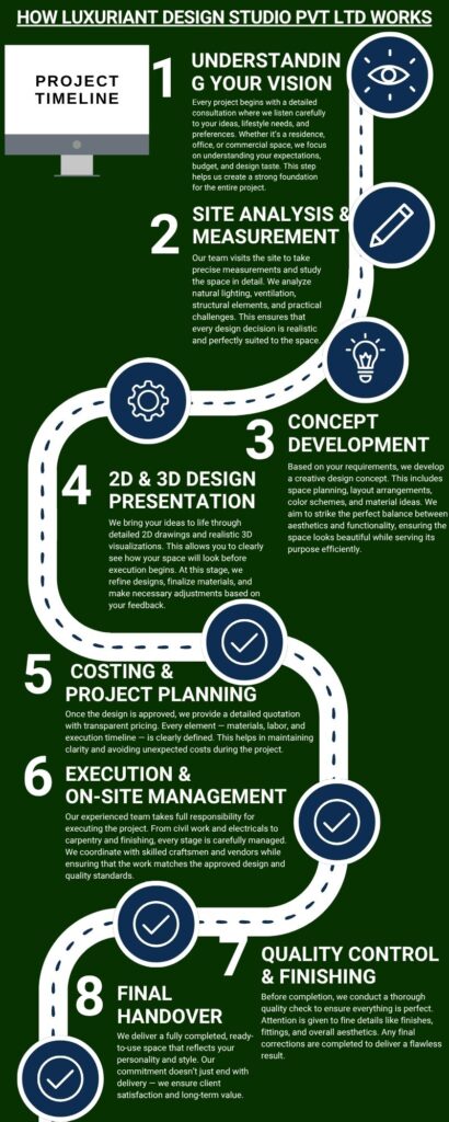 At Luxuriant Design Studio Pvt Ltd, every project is handled with a structured approach that blends creativity, technical expertise, and professional execution. The goal is simple — to transform your vision into a functional and luxurious space without stress.